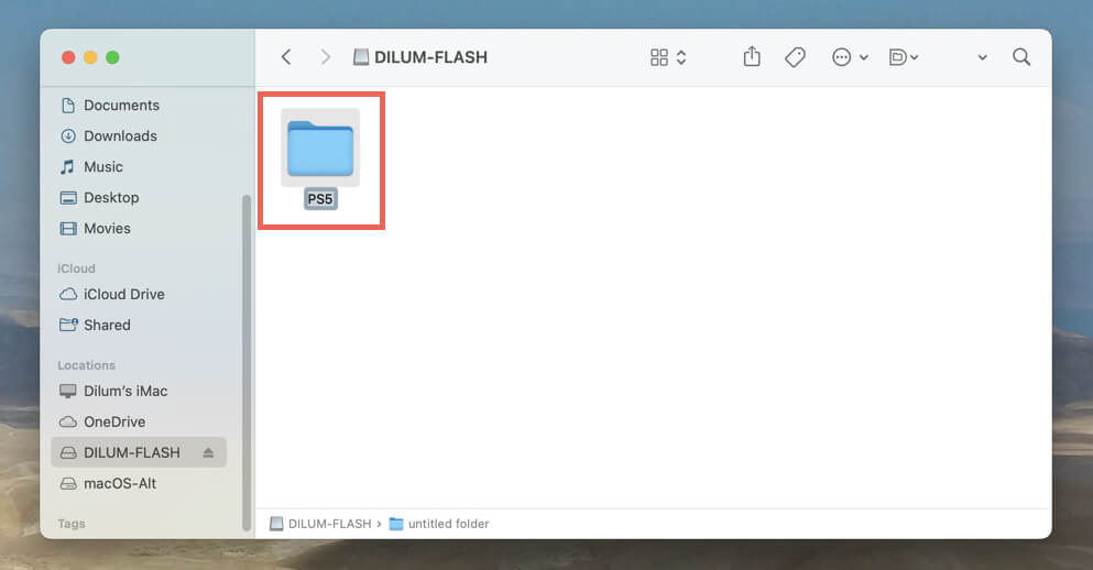- Ανοίξτε τη μονάδα USB μέσω εξερευνητή αρχείων ή Finder και δημιουργήστε έναν φάκελο με την ετικέταPS5και ένα υπο-φουσκωμένο επισημασμένοΕΚΣΥΓΧΡΟΝΙΖΩ.