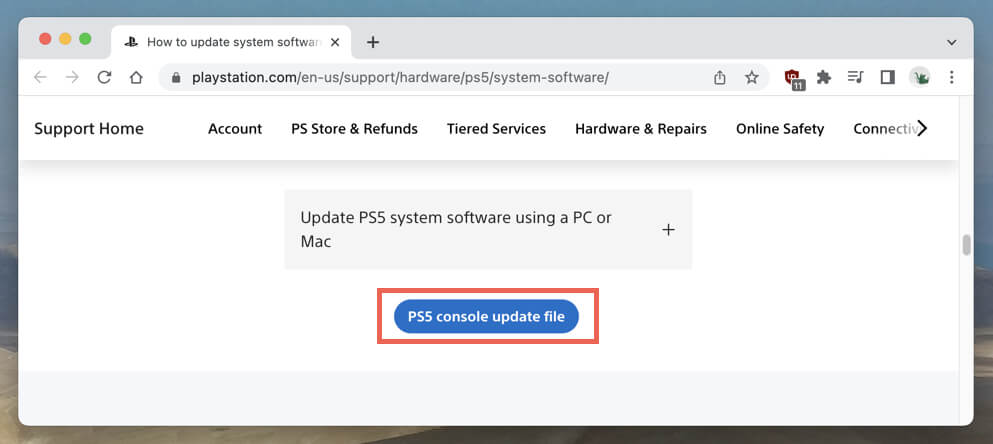 - Κατεβάστε την τελευταία έκδοση του TheΑρχείο ενημέρωσης κονσόλας PS5από την υποστήριξη του PlayStation.