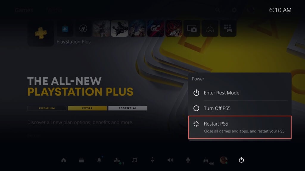 Μια άλλη γρήγορη επιδιόρθωση είναι η επανεκκίνηση του PS5 σας. Η διαδικασία ξεπλένει τη μνήμη της κονσόλας και καθαρίζει τις τεχνικές ανωμαλίες που προκαλούν ζητήματα ενημέρωσης λογισμικού. Να γίνει αυτό: