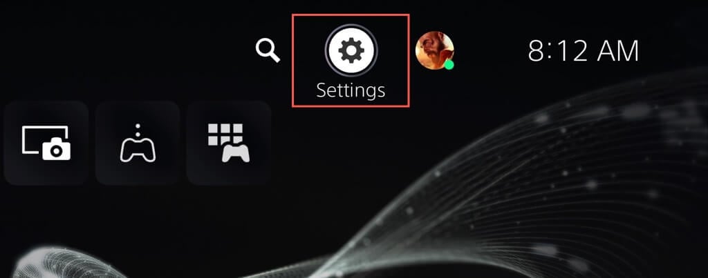- Επιλέξτε τοΡυθμίσειςκουμπί στην επάνω αριστερή γωνία της αρχικής οθόνης PS5.