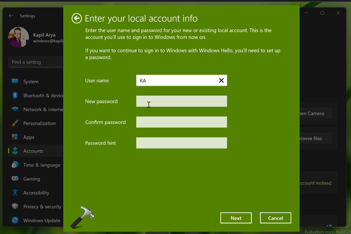 5. Πληκτρολογήστε τις πληροφορίες για τον τοπικό σας λογαριασμό. Κάντε κλικ στο κουμπί Επόμενο.