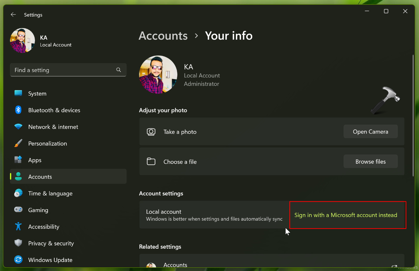 3. Κάτω από την επικεφαλίδα των ρυθμίσεων του λογαριασμού, κάντε κλικ στον σύνδεσμο λέγονταςΣυνδεθείτε με έναν τοπικό λογαριασμόσύνδεσμος.