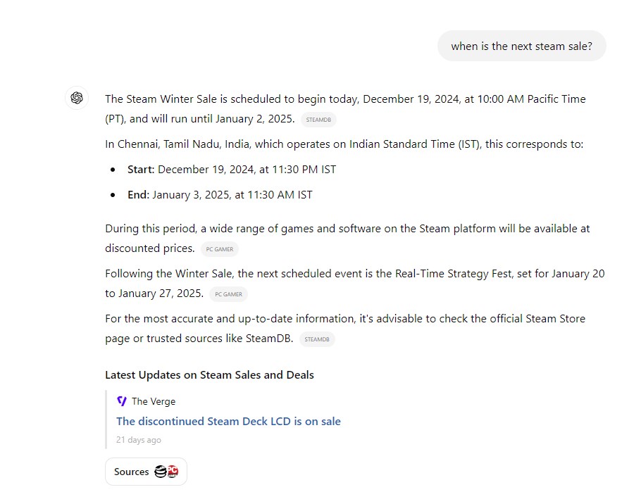 4. Η αναζήτηση ChatGPT θα εμφανίσει τα σχετικά αποτελέσματα, μαζί με τις αναφορές από τις οποίες τραβήχτηκαν οι πληροφορίες.