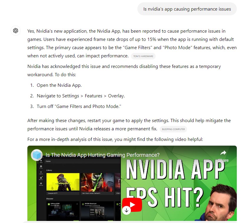 Τα αποτελέσματα αναζήτησης του ChatGPT περιλαμβάνουν τις πηγές και το bot εμφανίζει ακόμη και ένα ενσωματωμένο βίντεο που σχετίζεται με το θέμα. Μπορείτε να δώσετε ανατροφοδότηση για να βελτιώσετε τα αποτελέσματα.