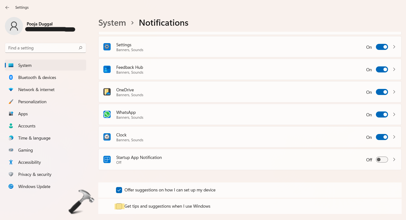 Απενεργοποιήστε τις συμβουλές και τις προτάσεις ειδοποιήσεις στα Windows 11