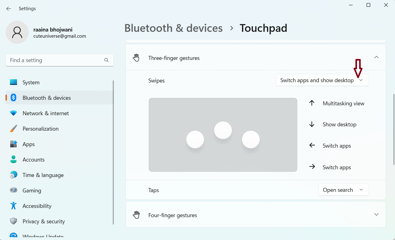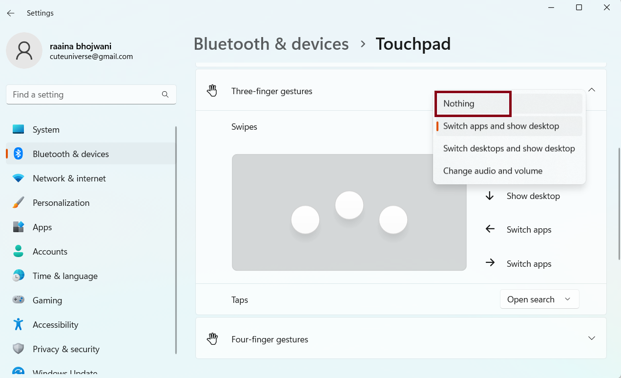 Το touchpad μπορεί να αναγνωρίσει την παλάμη σας ως χειρονομία τριών δακτύλων και να δείξει μια προβολή εργασιών και εφαρμογές μεταγωγής. Για να διορθώσετε αυτό το πρόβλημα απλώς απενεργοποιήστε τη χειρονομία 3 δακτύλων στις ρυθμίσεις όπως δίνεται στα παρακάτω βήματα: