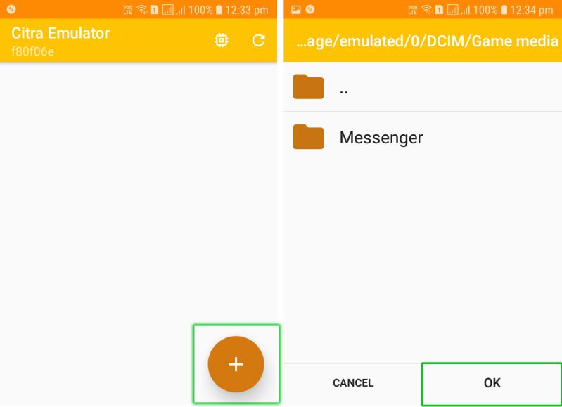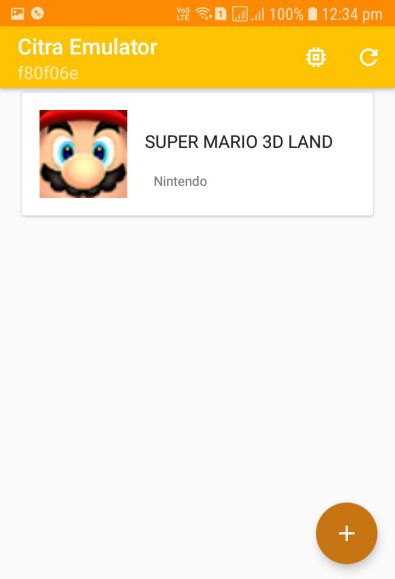 Για να παίξετε παιχνίδια με την Citra στο Android, το πρώτο πράγμα που πρέπει να κάνετε είναιΦορτώστε τη λίστα των παιχνιδιών που θέλετε να παίξετε, για να το κάνετε αυτό, πρέπει να τους αποκρυπτογραφήσετε και να το έχετε στην κάρτα SD ή στο τηλέφωνο. Μόλις το έχετε,Πατήστε στο κουμπί "+".