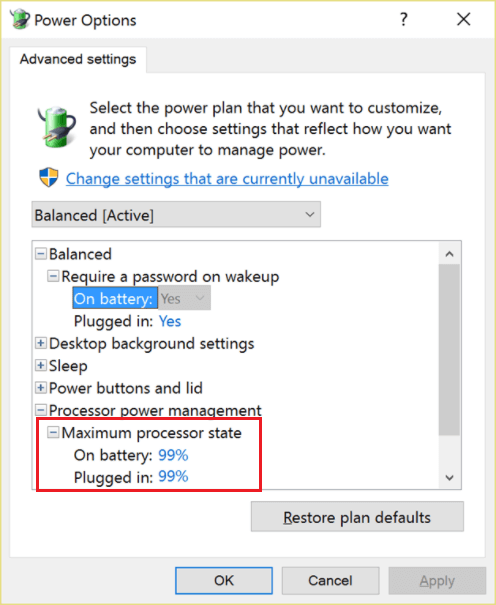 5. ΔιαστέλλωΔιαχείριση ενέργειας επεξεργαστήκαι κάντε κλικ στο κουμπίΜέγιστη κατάσταση επεξεργαστή.