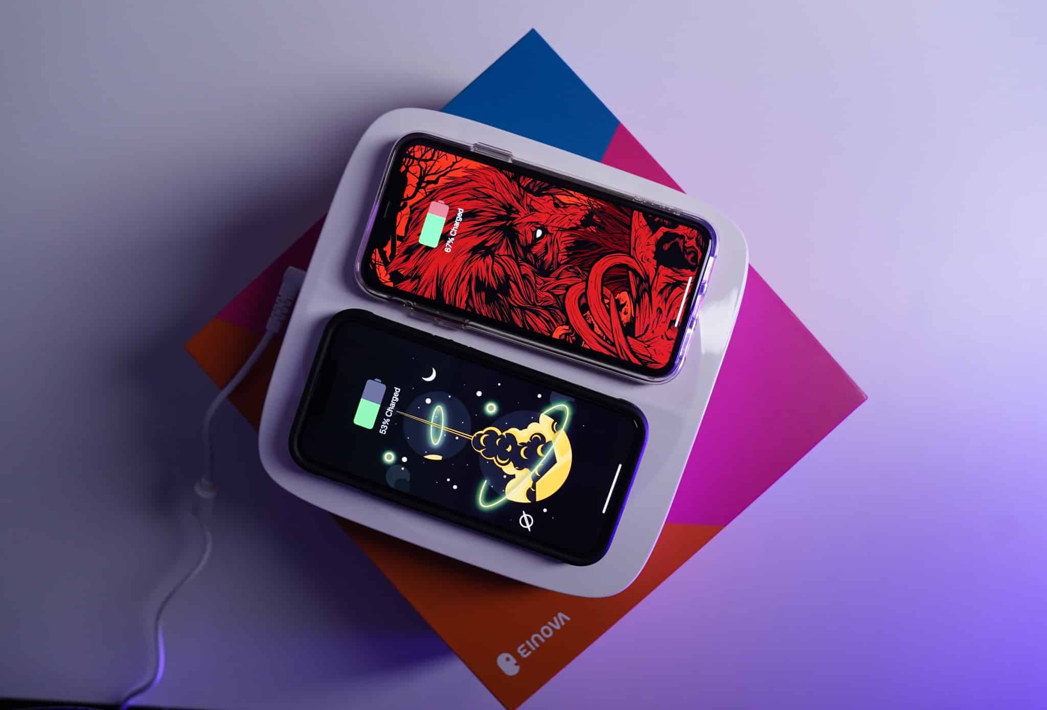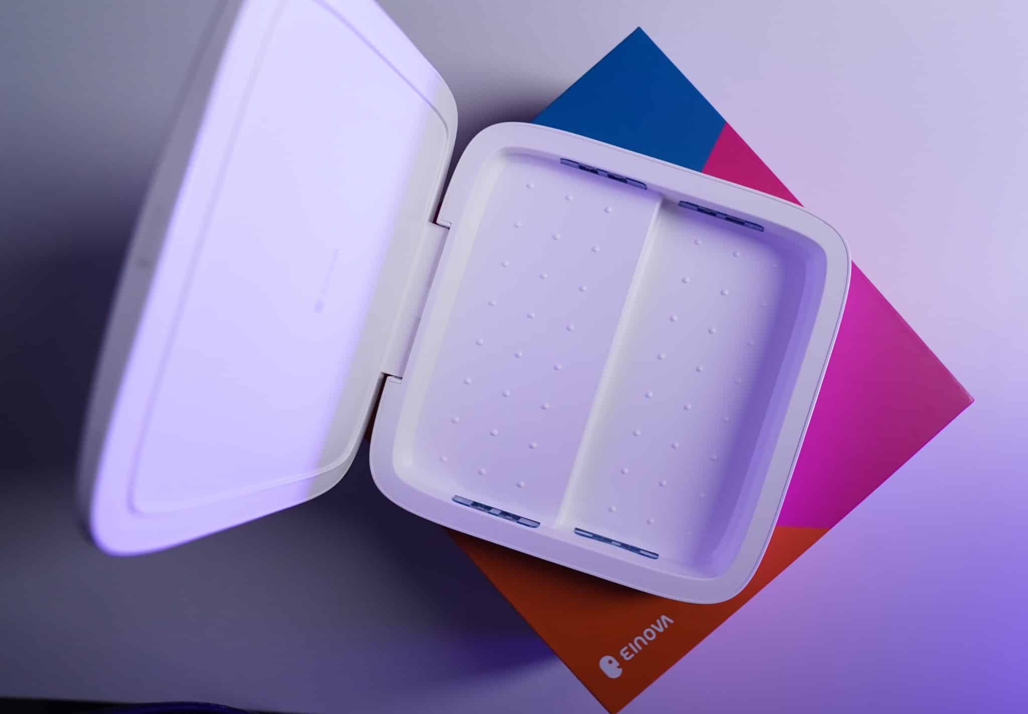 Το Einova Mundus Pro είναι η μόνη συσκευή που μπορεί ταυτόχρονα να χρεώνει τρεις συσκευές, απαλλαγμένα και απολύμανση συσκευών μέσω UV-C. Το μόνο που χρειάζεται να κάνετε είναι να τοποθετήσετε τη συσκευή σας παράλληλα με τα airpods, τα κλειδιά, τα γυαλιά ηλίου ή οτιδήποτε αισθάνεστε ότι χρειάζεται απολύμανση για οκτώ λεπτά στο κουτί φόρτισης.