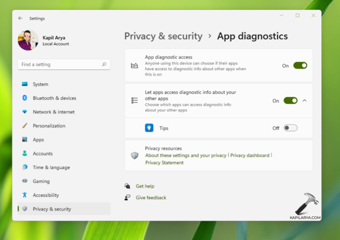 Συνήθως, οι εφαρμογές που θα χρησιμοποιήσετε στα Windows είναι προσεκτικά απομονωμένες έτσι ώστε να μην παρεμποδίζονται μεταξύ τους. Ωστόσο, ενδέχεται να υπάρχουν σενάρια όπου μπορεί να είναι χρήσιμο για μια εφαρμογή να βλέπει ορισμένους τύπους πληροφοριών σχετικά με άλλες εφαρμογές που τρέχουν. Ένα πολύ εύκολο παράδειγμα είναι τα διαγνωστικά εργαλεία, τα οποία θα μπορούσαν να επωφεληθούν από τη λήψη μιας λίστας εφαρμογών που τρέχουν. Αυτό είναι ιδιαίτερα χρήσιμο κατά τη διάρκεια της ανάπτυξης εφαρμογών ή για εφαρμογές όπως το Task Manager που αναφέρουν απλές πληροφορίες σχετικά με την εκτέλεση εφαρμογών. Εάν ανησυχείτε για μια εφαρμογή που λαμβάνει πληροφορίες από οποιεσδήποτε άλλες εφαρμογές που χρησιμοποιείτε στο σύστημα, αυτό το άρθρο είναι για εσάς. Τα Windows σας δίνουν πάντα τον έλεγχο των εφαρμογών που μπορούν να λάβουν αυτό το είδος πληροφοριών σχετικά με άλλες εφαρμογές που τρέχουν. Σε αυτό το άρθρο, θα δούμε πώς μπορείτε να ενεργοποιήσετε/απενεργοποιήσετε την πρόσβαση στο Diagnostics App στα Windows 11.