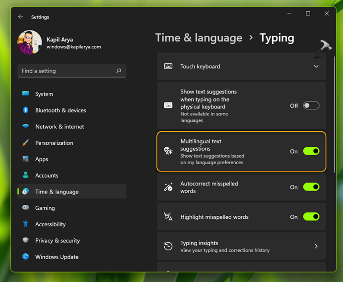 Όταν έχετε ενεργοποιήσει τις πολύγλωστες προτάσεις κειμένου, δεν χρειάζεται να αλλάζετε τη γλώσσα με το πληκτρολόγιο αφής εάν πληκτρολογείτε σε περισσότερες από μία λατινικές γλώσσες. Μπορείτε να συνεχίσετε να πληκτρολογείτε σε πολλές γλώσσες και τα Windows θα σας βοηθήσουν παρουσιάζοντας προβλέψεις από πολλές γλώσσες για να σας κάνουν πιο παραγωγικούς. Νωρίτερα, το επιπλέον βήμα της χειροκίνητης εναλλαγής μεταξύ των γλωσσών ήταν προκλητικό για τους χρήστες που είναι πολύ γλωσσικοί. Η Microsoft εισήγαγε τη δυνατότητα πολύγλωσσων προτάσεων κειμένου στα Windows 10 για να ξεπεράσει αυτές τις προκλήσεις και να σας επιτρέψει να πληκτρολογήσετε εύκολα σε πολλές γλώσσες. Αυτή η λειτουργία συνεχίζεται επίσης με τα Windows 11.
