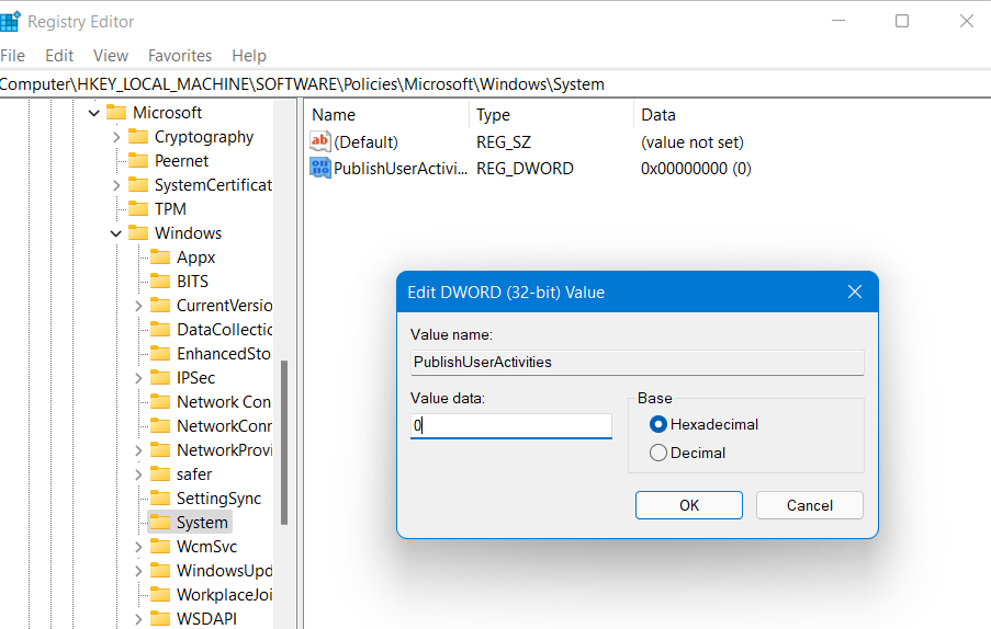 Ή αλλιώς, κάντε διπλό κλικ στοPublishUserActivitiesκαι να αλλάξει τα δεδομένα της αξίας σε αυτό θα απενεργοποιήσει το ιστορικό δραστηριότητας στα Windows 11.