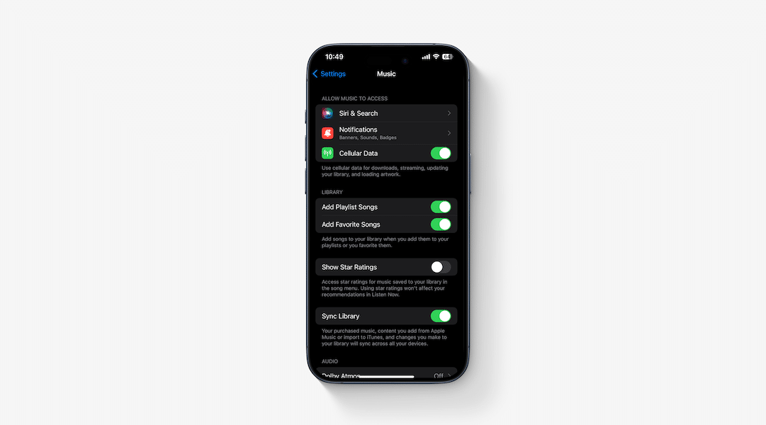 - Προσθήκη αγαπημένων τραγουδιών εναλλαγήπροστίθεται στις ρυθμίσεις της Apple Music στην εφαρμογή Ρυθμίσεις. Όταν ενεργοποιείται, θα προσθέσει αυτόματα τα αγαπημένα τραγούδια στη βιβλιοθήκη σας.