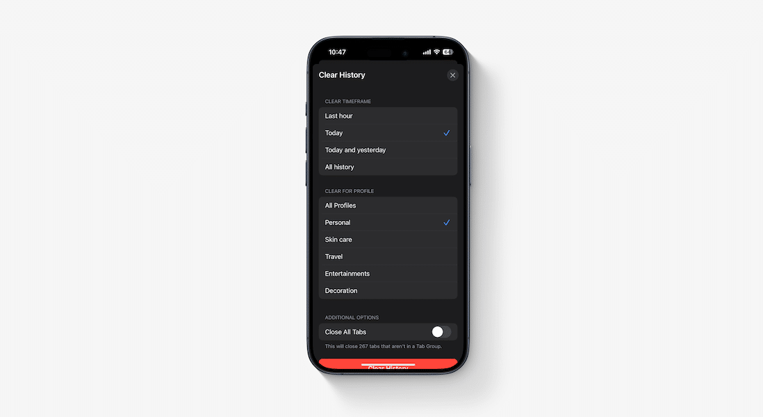 - Καθαρή ρύθμιση ιστορικούΣτο σαφάρι δεν αλλάζει. Εάν επιλέξετε ένα συγκεκριμένο χρονικό πλαίσιο, η εφαρμογή θα θυμάται και θα το κρατήσει το ίδιο. Προηγουμένως, η ρύθμιση του καθαρού ιστορικού επανήλθε σε προεπιλογή όταν οι χρήστες έκλεισαν την εφαρμογή.