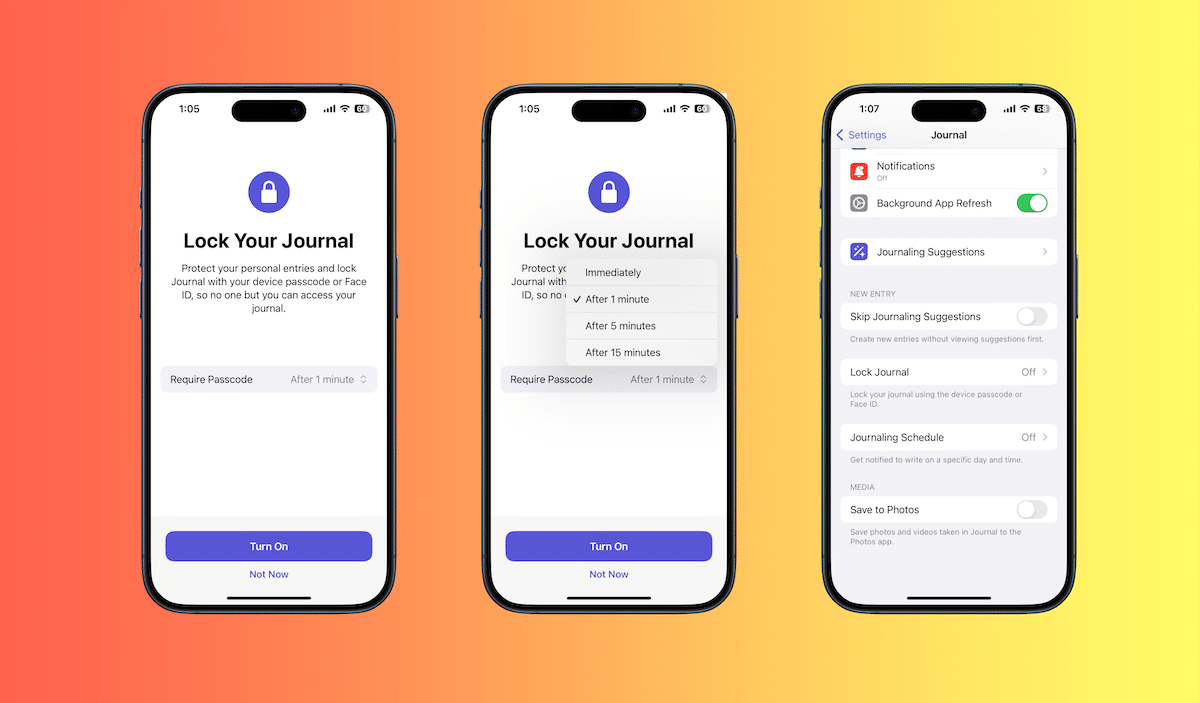 - Κλειδώστε την οθόνη του περιοδικού σαςΣτην εφαρμογή Jounral ειδοποιεί τους χρήστες ότι μπορούν να κλειδώσουν την εφαρμογή για να προστατεύσουν τις καταχωρήσεις τους από τα αδιάκριτα μάτια. Η οθόνη Splash προστίθεται επειδή η επιλογή κλειδώματος της εφαρμογής είναι διαθέσιμη στην εφαρμογή Ρυθμίσεις> jounral και όχι πουθενά στην εφαρμογή.