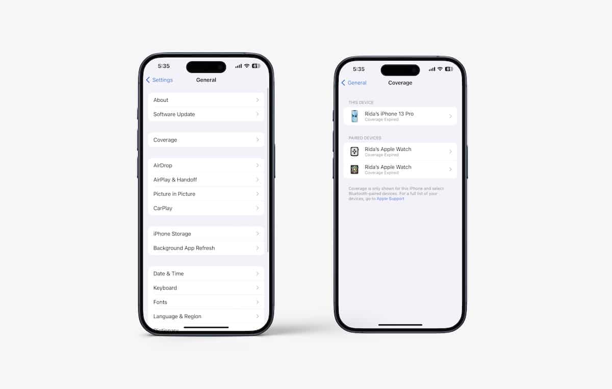 - Η εγγύηση AppleCare + αντικαθιστάΗ ετικέτα κάλυψης στην εφαρμογή Ρυθμίσεις. Προστέθηκε στο iOS 17.2 Beta 2 Στο γενικό τμήμα της εφαρμογής ρυθμίσεων, η ενότητα παραθέτει λεπτομέρειες για όλες τις συσκευές Apple των χρηστών κάτω από και εκτός εγγύησης AppleCare.