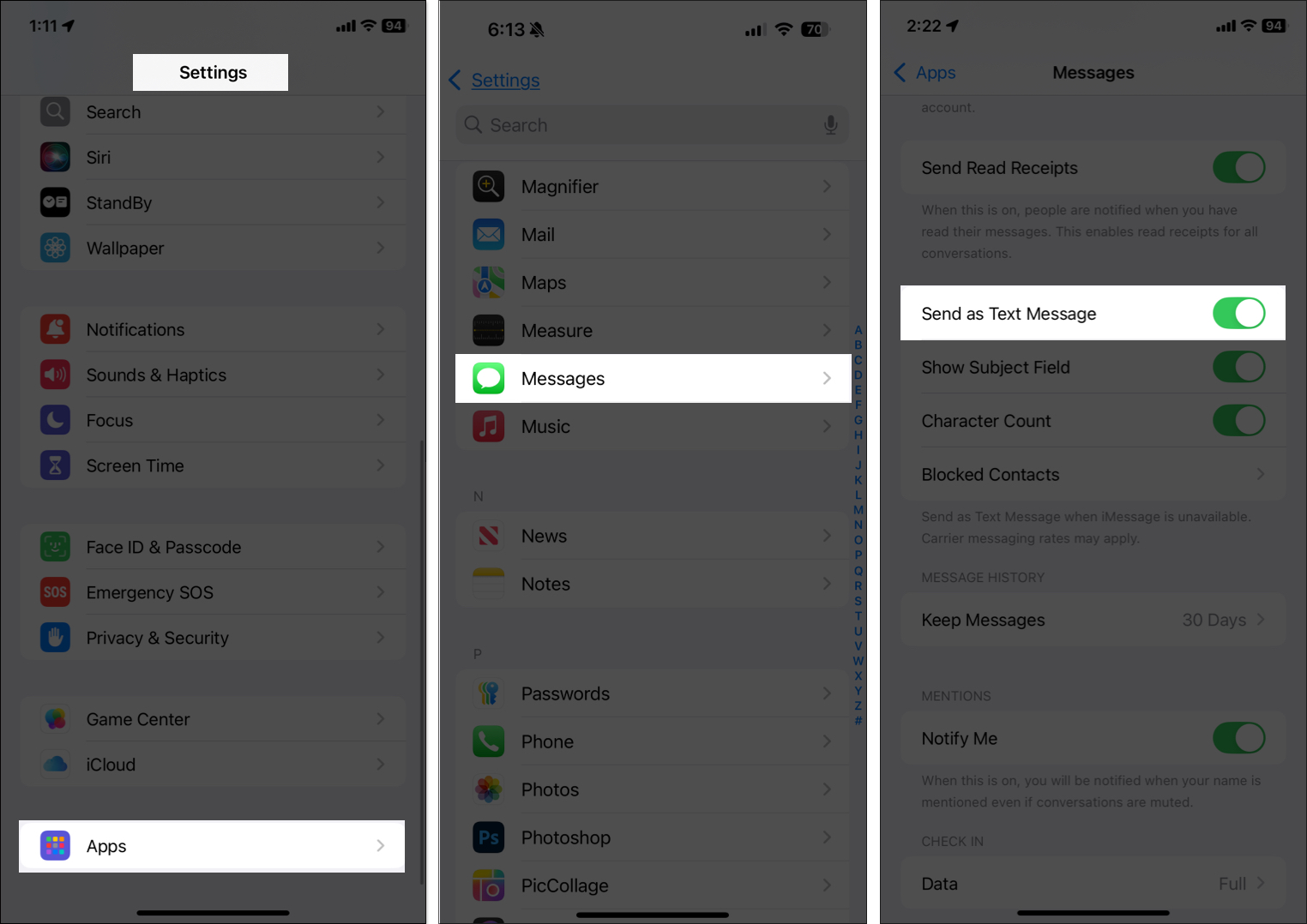 Έτσι, βεβαιωθείτε ότι το SMS είναι ενεργοποιημένο στο iPhone σας πηγαίνονταςΡυθμίσεις→Εφαρμογές→Μηνύματακαι εξασφαλίζονταςΑποστολή ως μήνυμα κειμένουείναι ενεργοποιημένο. Τώρα, δοκιμάστε να στείλετε ένα μήνυμα κειμένου (όχι ένα iMessage) σε έναν φίλο Android ή άλλο αριθμό τηλεφώνου. Εάν το μήνυμα αποτύχει να σταλεί, ενδέχεται να έχετε ένα πρόβλημα κάρτας μεταφοράς ή κάρτας SIM.