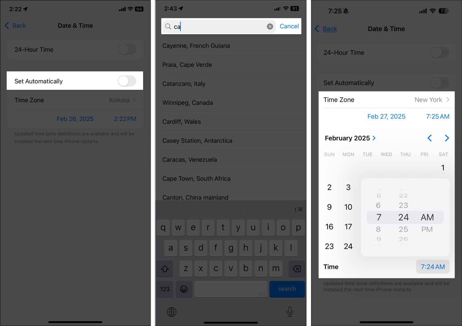 Εναλλακτικά, μπορείτε να απενεργοποιήσετε τοΟρίστε αυτόματαΕπιλογή για την προσαρμογή της ημερομηνίας, της ώρας και της ζώνης ώρας με μη αυτόματο τρόπο. ΠαρακέντησηΖώνη ώραςκαι πληκτρολογήστε την πόλη σας ή πλησιέστερη μεγάλη πόλη. Στη συνέχεια, επιλέξτεΗμερομηνία & ώραΤμήμα και ρυθμίστε το στη σωστή ώρα. Τέλος, επανεκκινήστε το iPhone σας και δείτε αν λειτουργεί το FaceTime.