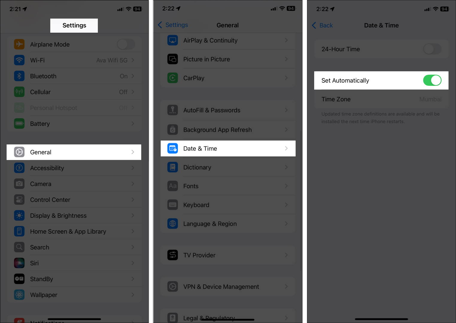 Αυτός είναι ο λόγος για τον οποίο η Apple συνιστά τη χρήση της αυτόματης λειτουργίας ρύθμισης χρόνου, η οποία συγχρονίζει τη συσκευή σας με τους διακομιστές της Apple και το τοπικό σας δίκτυο. Για να το κάνετε αυτό, ανοίξτεΡυθμίσεις, πηγαίνωΓενικός, και πατήστεΗμερομηνία & ώρα. Τώρα, εναλλαγήΟρίστε αυτόματακαι βεβαιωθείτε ότι η ζώνη ώρας σας είναι σωστή. Εάν είναι λανθασμένο, επανεκκινήστε το τηλέφωνό σας και ελέγξτε ξανά.