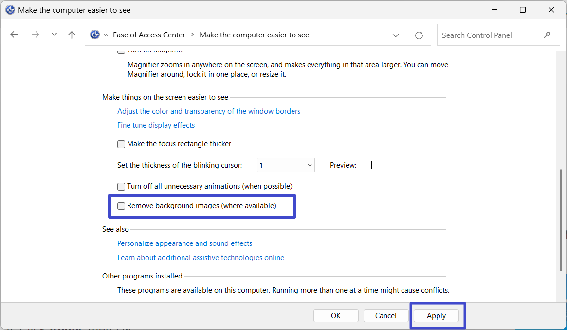 3. Καταργήστε το "Αφαιρέστε τις εικόνες φόντου (όπου διαθέσιμο) "και κάντε κλικ στο "Εφαρμόζω". Στη συνέχεια, κάντε κλικ στο "ΕΝΤΑΞΕΙ«.