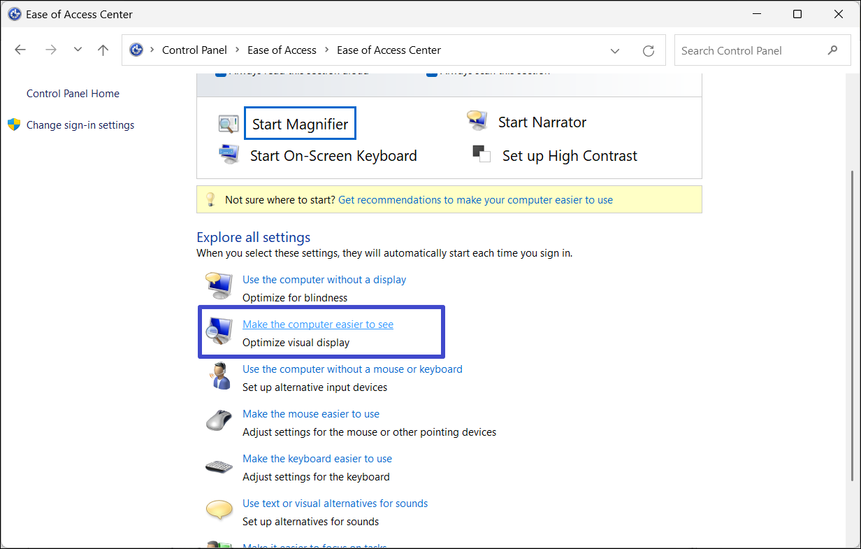 2. Κάτω από την Εξερεύνηση όλων των ρυθμίσεων, κάντε κλικ στο "Κάντε τον υπολογιστή πιο εύκολο να δείτε«.