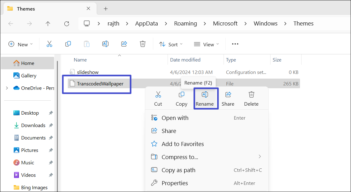 2. Μόλις ανοίξει, μετονομασία ή διαγραφή του φακέλου θεμάτων "Ταπετσαρία"Αρχείο. Κάντε δεξί κλικ στο αρχείο και επιλέξτε"Μετονομάζω". Αλλάξτε το όνομα σε"Transcoded wallpaper.bak "ή κάτι άλλο.