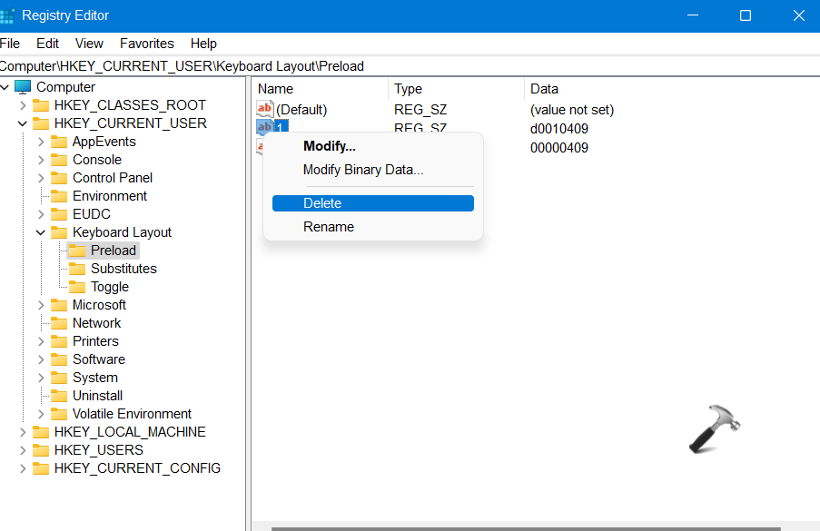 Εάν εξακολουθείτε να αντιμετωπίζετε το ίδιο ζήτημα, τότε είναι καλύτερο να χρησιμοποιήσετε τον επεξεργαστή μητρώου. Αυτό το ζήτημα προκύπτει λόγω ορισμένων αρχείων μητρώου που υπάρχουν στο σύστημα. Έτσι, ας δούμε πώς να διορθώσετε δεν μπορεί να καταργήσει μια διάταξη πληκτρολογίου στο ζήτημα των Windows 11 χρησιμοποιώντας τον επεξεργαστή μητρώου.