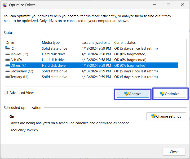 3. Πρώτον, κάντε κλικ στο "Αναλύω"Για να αναλύσετε το δίσκο για κατακερματισμό. Στη συνέχεια, κάντε κλικ στην επιλογή"Βελτιστοποιώ"Για την απόρριψη της μονάδας δίσκου.