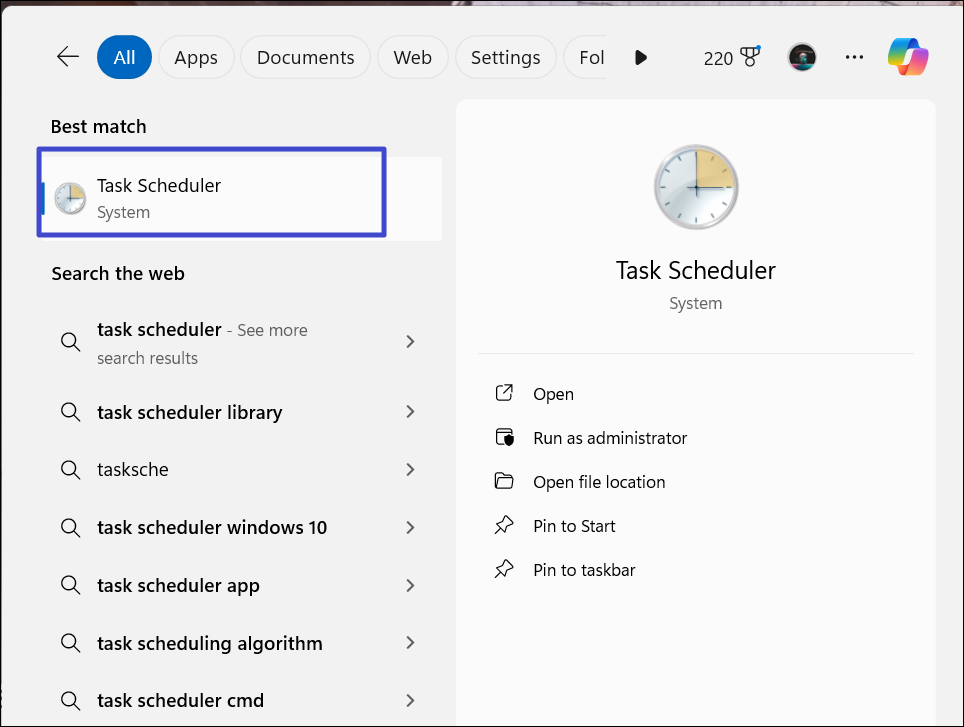1. Πατήστε Windows + S, πληκτρολογήστε "Προγραμματιστής εργασιών"Και επιλέξτε το"Προγραμματιστής εργασιών"Χρησιμότητα.