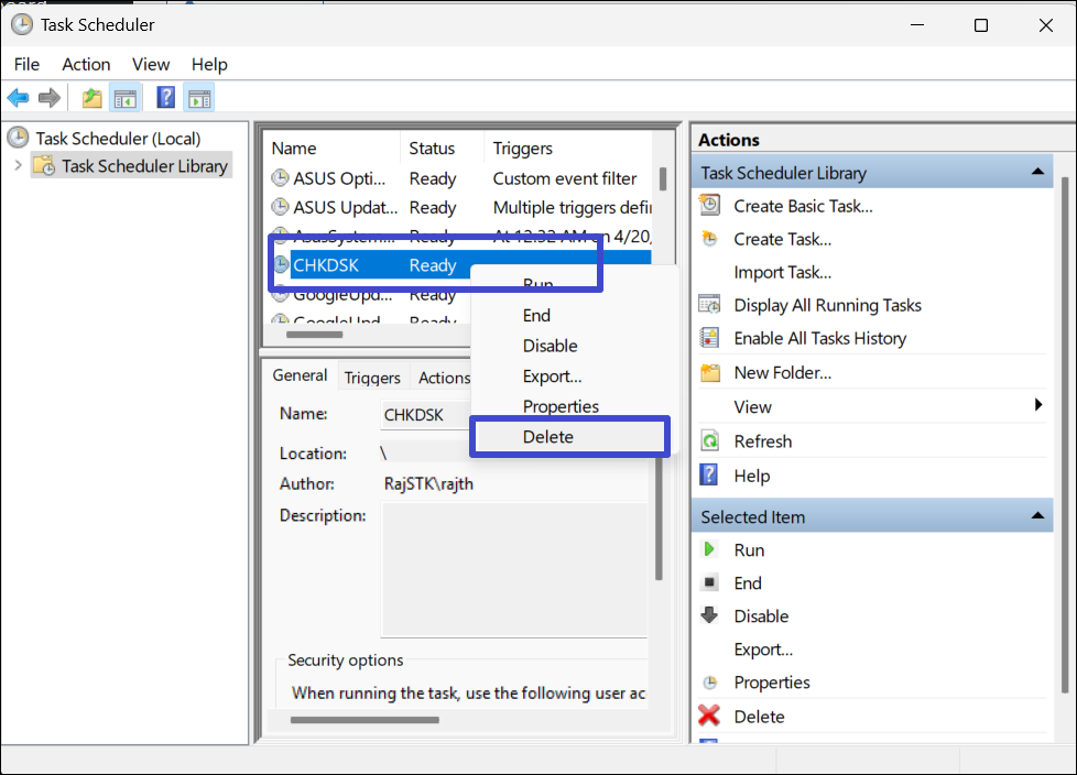 Σε ορισμένες περιπτώσεις, εάν το Chkdsk έχει οριστεί ως προγραμματισμένη εργασία, μπορεί να κολλήσει όταν ξεκινά τα Windows. Για να αποφευχθεί αυτό, πρέπει να καταργήσετε το CHDSK από τη λίστα προγραμματισμένων εργασιών.