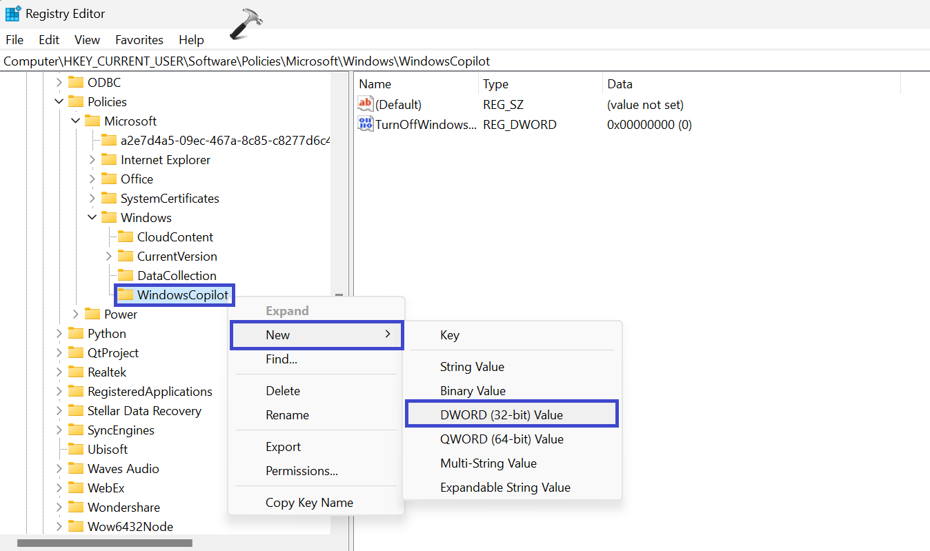 4. Τώρα, κάντε δεξί κλικ στο "Windowscopilot"Κλειδί μητρώου και, στη συνέχεια, κάντε κλικ στο"Νέα => τιμή DWORD (32-bit)«.