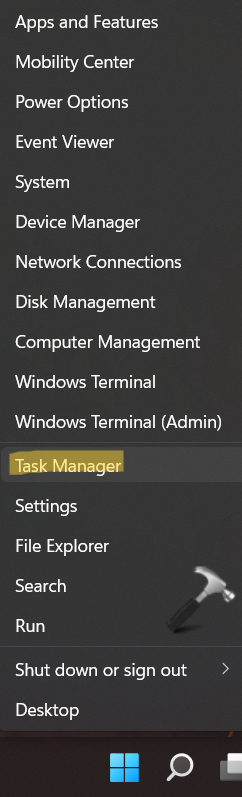 1.ΑνοιχτόΔιαχειριστής εργασιώνκάνοντας δεξί κλικ στοΕκκίνηση των Windowsκουμπί που παρουσιάζεται στη γραμμή εργασιών.