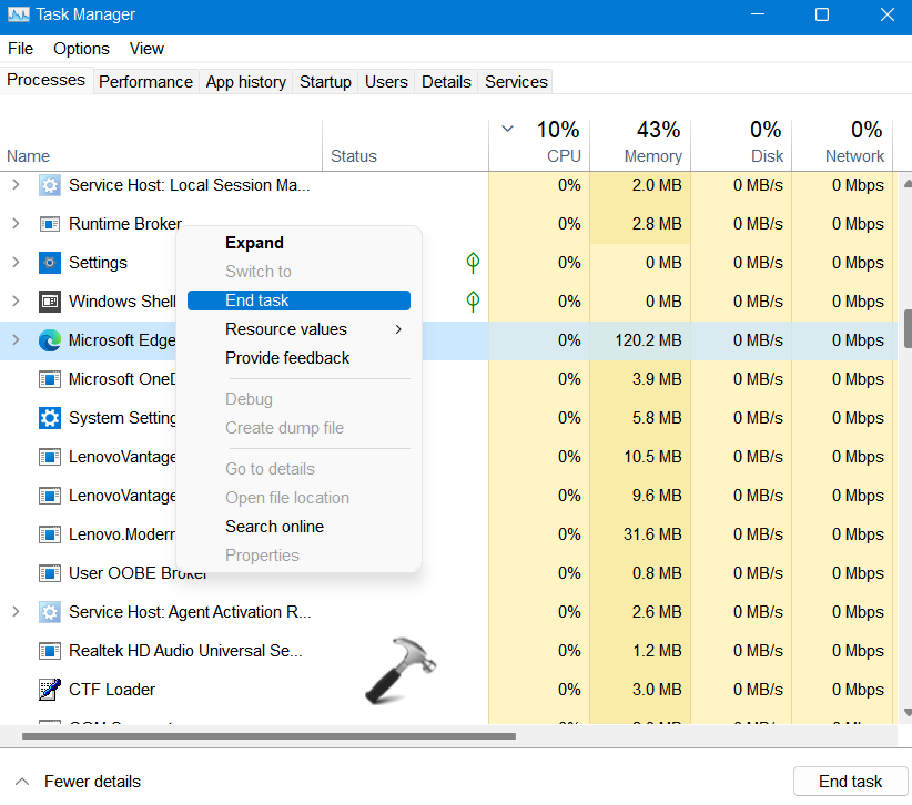 2.Πηγαίνετε στοΔιαδικασίεςΚαρτέλα και κάντε δεξί κλικ στη διαδικασία που θέλετε να τελειώσετε. Στη συνέχεια, επιλέξτεΤελική εργασία.