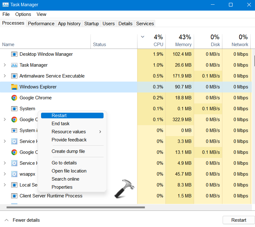 2.Πηγαίνετε στοΔιαδικασίεςκαρτέλα και κάντε δεξί κλικ στοΕξερευνητής των Windowsδιαδικασία. Στη συνέχεια, επιλέξτεΕπανεκκίνησηαπό το μενού περιβάλλοντος.