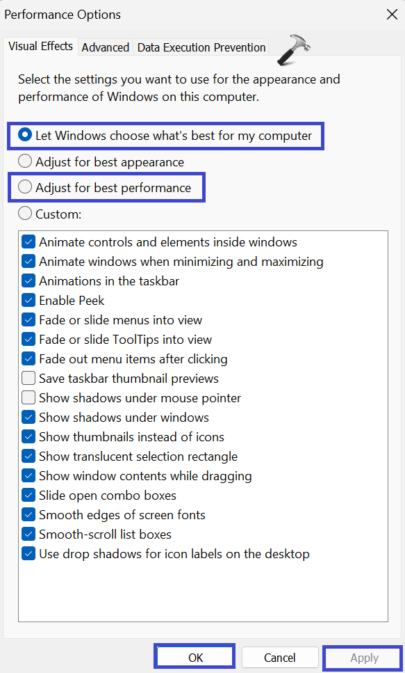 2. Επιλέξτε το "Ρυθμίστε για την καλύτερη απόδοση"Επιλογή.