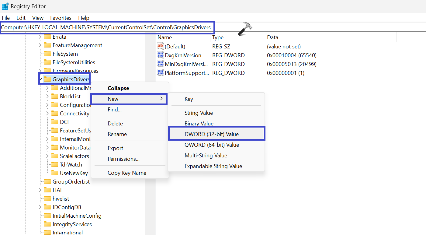 3. Τώρα, κάντε δεξί κλικ στο "GraphicsDrivers "και επιλέξτε "Νέα => τιμή DWORD (32-bit)«.