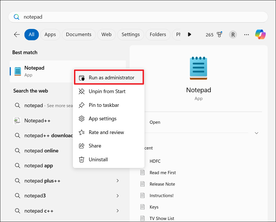 1. Αναζητήστε "Μπλοκ«Στο μενού έναρξης και, στη συνέχεια, κάντε δεξί κλικ στο αποτέλεσμα και επιλέξτε»Εκτελέστε ως διαχειριστής'.