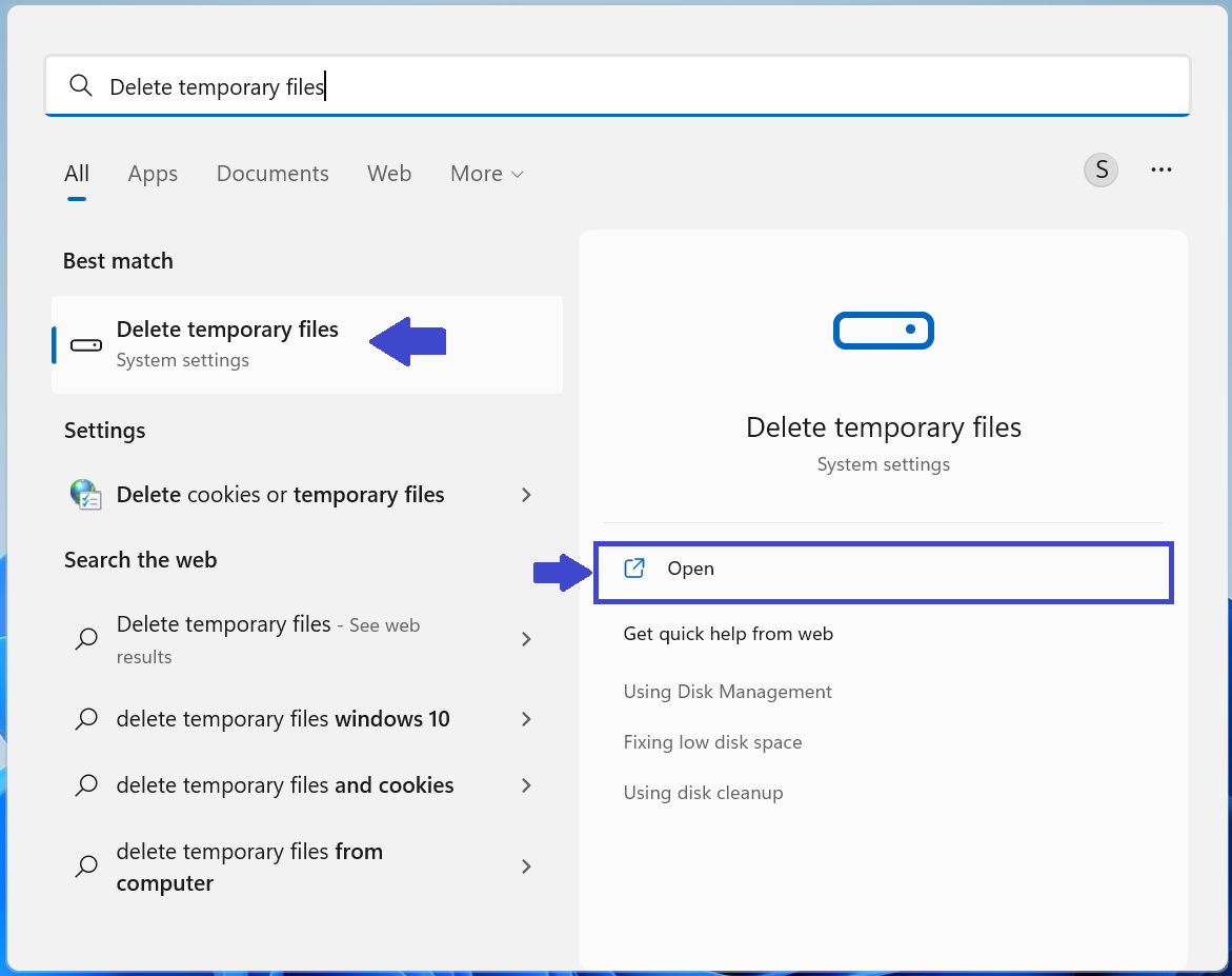 1. Πληκτρολογήστε "Διαγραφή προσωρινών αρχείων" στο πλαίσιο αναζήτησης και κάντε κλικ στο "Άνοιγμα".