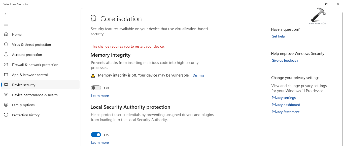 Βήμα 2-Τέλος, ενεργοποιήστε τη λειτουργία ακεραιότητας μνήμης και επανεκκινήστε τον υπολογιστή.