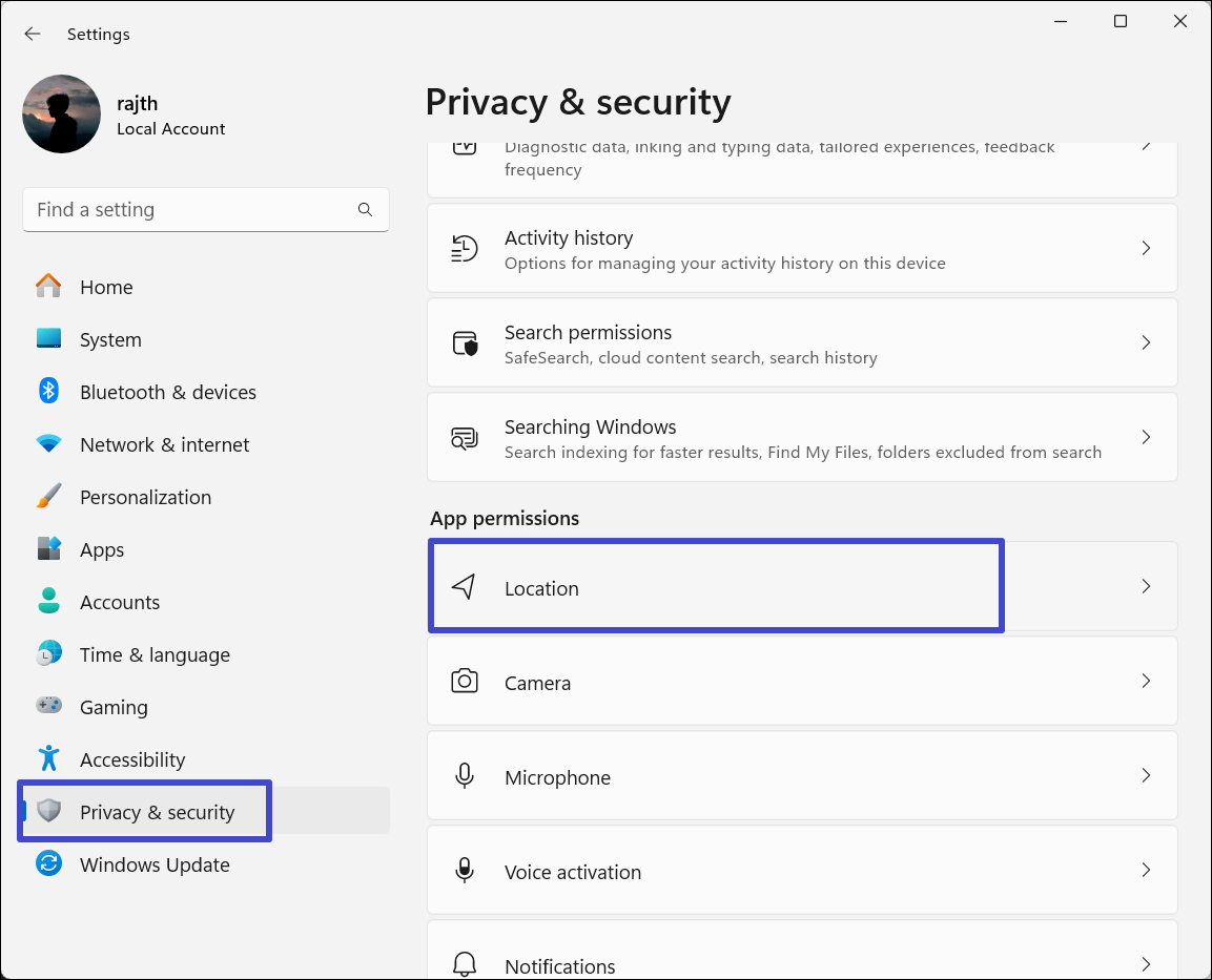 2. Πηγαίνετε στο "Ιδιωτικότητα και ασφάλεια "καρτέλα, στη συνέχεια μετακινηθείτε προς τα κάτω και επιλέξτε 'Τοποθεσία«Σύμφωνα με τα δικαιώματα εφαρμογής.