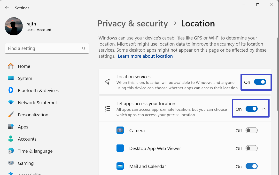 3. Ενεργοποιήστε το "Υπηρεσίες τοποθεσίας"Εναλλαγή. Επίσης, βεβαιωθείτε ότι" "Αφήστε τις εφαρμογές να έχουν πρόσβαση στην τοποθεσία σας"Το Toggle είναι ενεργοποιημένο.
