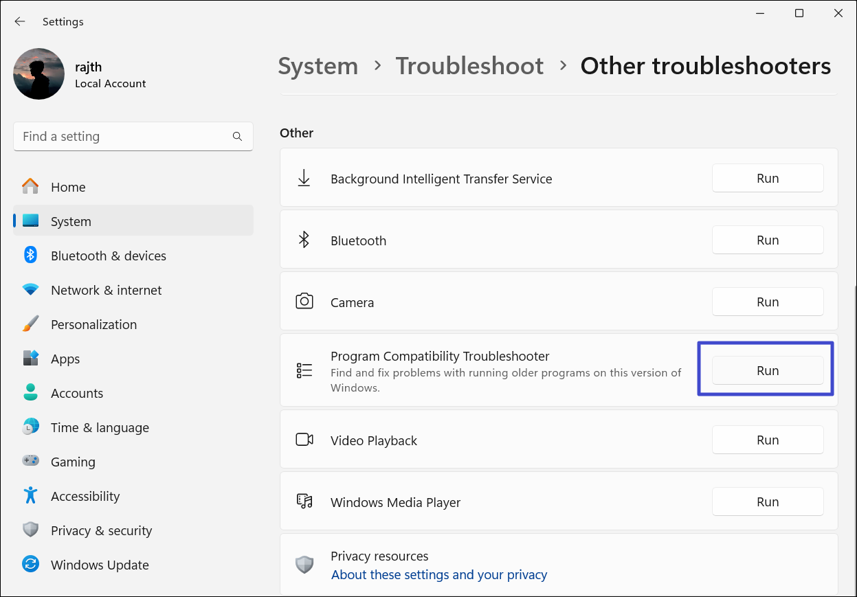 3. Μετακινηθείτε προς τα κάτω και κάντε κλικ στο "Τρέξιμο"Κουμπί δίπλα στο"Αντιμετώπιση προβλημάτων συμβατότητας προγράμματος«.