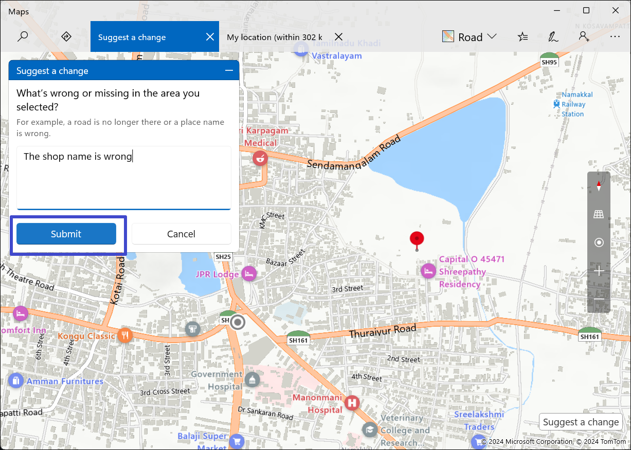 Η πρότασή σας θα υποβληθεί στην ομάδα MAPS για αναθεώρηση. Μόλις εγκριθεί, η αλλαγή θα είναι ορατή σε μια μελλοντική ενημέρωση χάρτη.