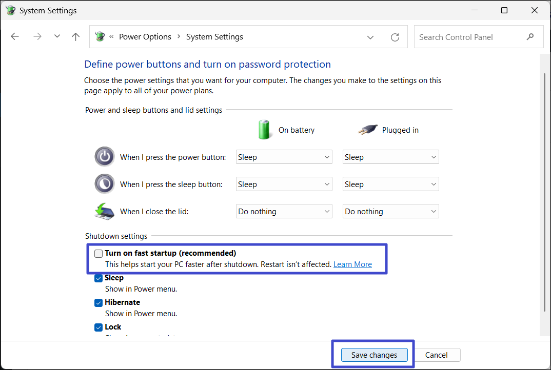 5. Καταργήστε το "Ενεργοποιήστε την γρήγορη εκκίνηση (συνιστάται)"Επιλογή και κάντε κλικ στο"Αποθήκευση αλλαγών«.