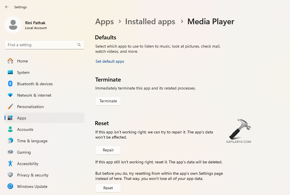 Διορθώστε 1: Επαναφορά της εφαρμογής Player Media Player Windows