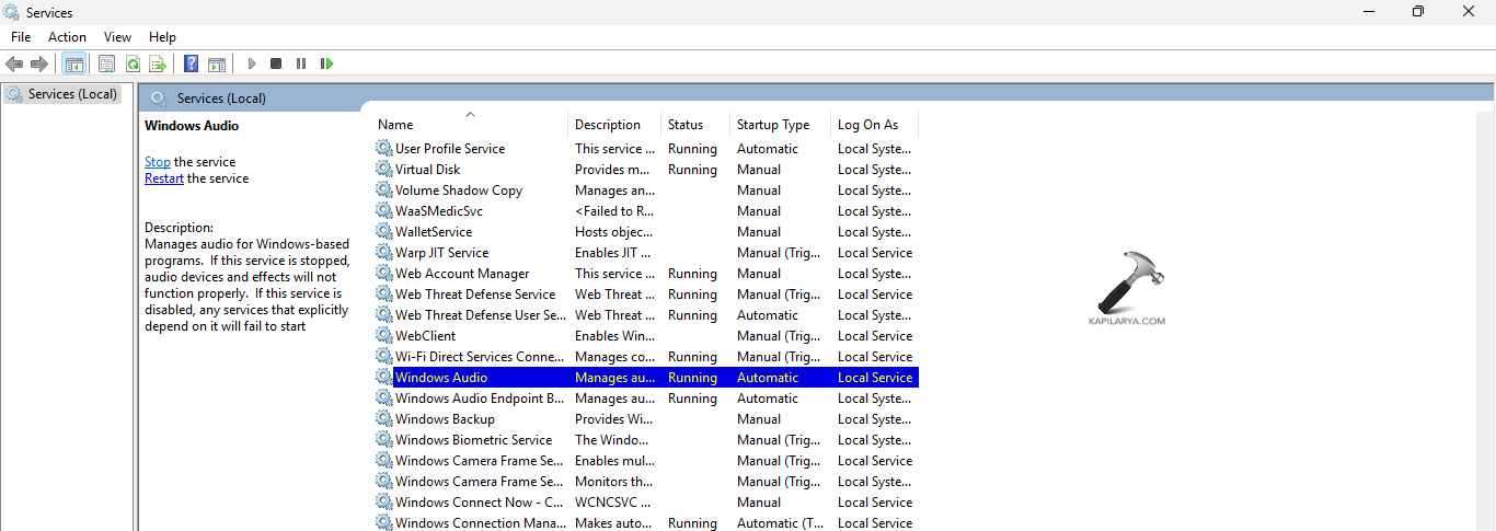 Βήμα 2-Τώρα, στο παράθυρο Υπηρεσιών, αναζητήστε την υπηρεσία ήχου των Windows.