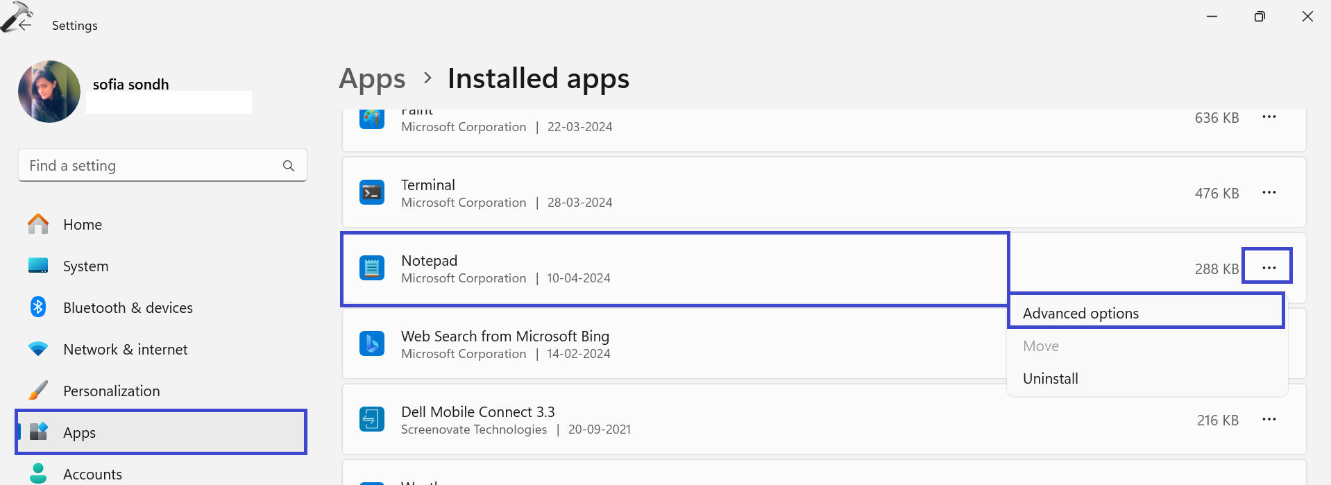 2. Εντοπίστε το σημειωματάριο. Κάντε κλικ (...) και επιλέξτε "Προχωρημένες επιλογές«.