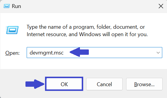 Βήμα 1:Πατήστε Win + R. Τύπος "Devmgmt.msc".