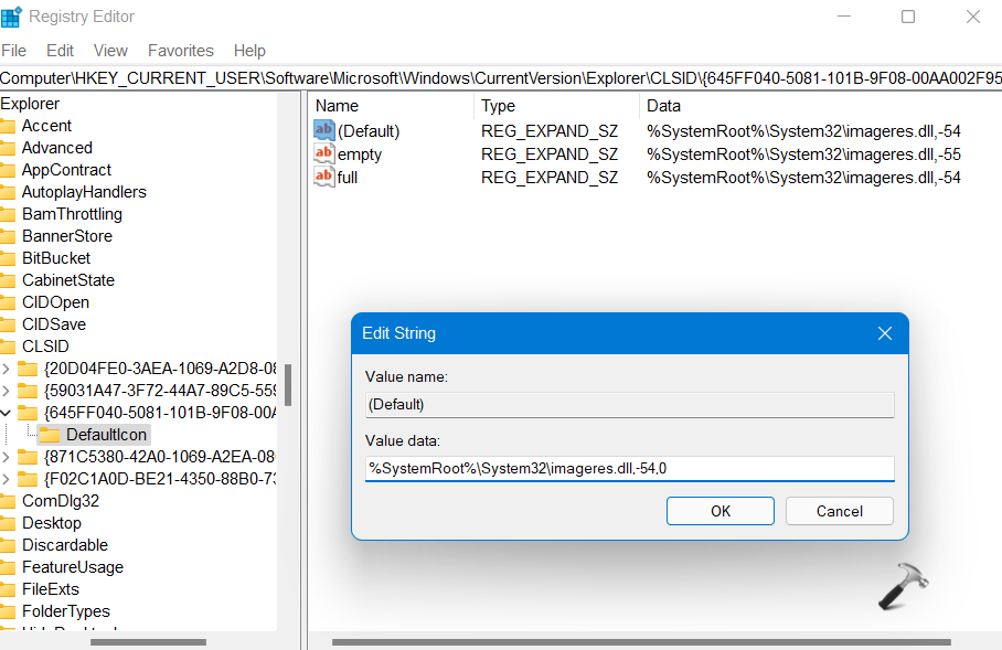 HKEY_CURRENT_USERSoftwareMicrosoftWindowsCurrentVersionExplorerCLSID{645FF040-5081-101B-9F08-00AA002F954E}DefaultIcon3.Μετά από αυτό, κάντε κλικ στοΠροεπιλεγμένοςκλειδί. Μόλις ολοκληρωθεί, κάντε διπλό κλικ στο(Αθέτηση)DWORD και ADD, 0Στο τέλος των δεδομένων αξίας του, δηλαδή%Systemroot%System32Imageres.dll.-54. Τώρα, προσθέστε, 0Στο τέλος των διαδρομών δεδομένων τιμών των πλήρων και κενών χορδών. Μόλις ολοκληρωθεί, πατήστεΕΝΤΑΞΕΙ.