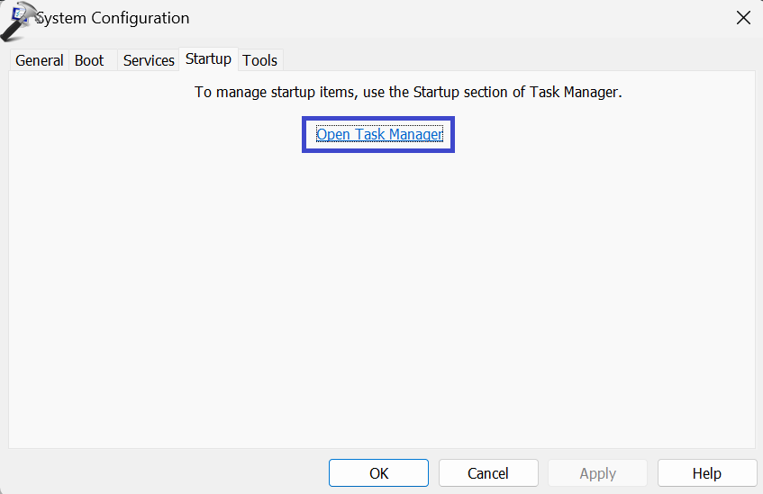 3. Τώρα, κάτω από την καρτέλα εκκίνησης, κάντε κλικ στο "Ανοίξτε τον διαχειριστή εργασιών«.